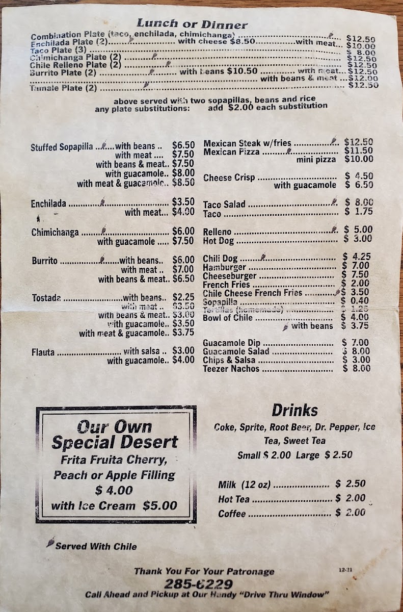Start your day with the El Cafecito Special or Huevos Rancheros, each served with crispy hashbrowns or warm tortillas, all under $7. At lunch or dinner, indulge in the famous Combination Plate featuring tacos, enchiladas, and chimichangas, complete with sopapillas, beans, and rice for just $9.50.